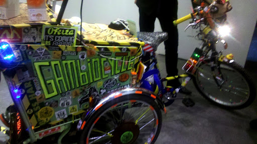 Havia sido convidado a jantar ali perto com algumas figuras importantes do mundo da arte/ciência/tecnologia, mas não me senti descansado o suficiente para encetar conversas conceituais aprofundadas em uma língua que não é a minha. Acabei tomando com Lucas o transporte oferecido pelo evento: um lindo e antigo ônibus escolar que nos levaria à abertura no 516 arts, galeria no centro da cidade. Bruno iria na bicicleta que alugara no lugar em que estava ficando. Já na entrada, encontramos os três gambiólogos. Já chegavam tirando onda: o Gambiociclo que fizeram nas semanas anteriores estava bem no hall da galeria. Lugar nobre. O ambiente estava lotado. Encontrei mais alguns conhecidos, mas o resquício de jet lag já estava me deixando em modo semi-social. O pessoal planejava sair de lá direto para uma microcervejaria local, mas acabei declinando. Voltei ao hotel com um cansaço pesado, mas ainda eram oito e pouco da noite. Encomendei pela internet um sanduíche de um lugar chamado Jimmy John's. Capotei às dez e pouco e só acordei às seis da manhã.